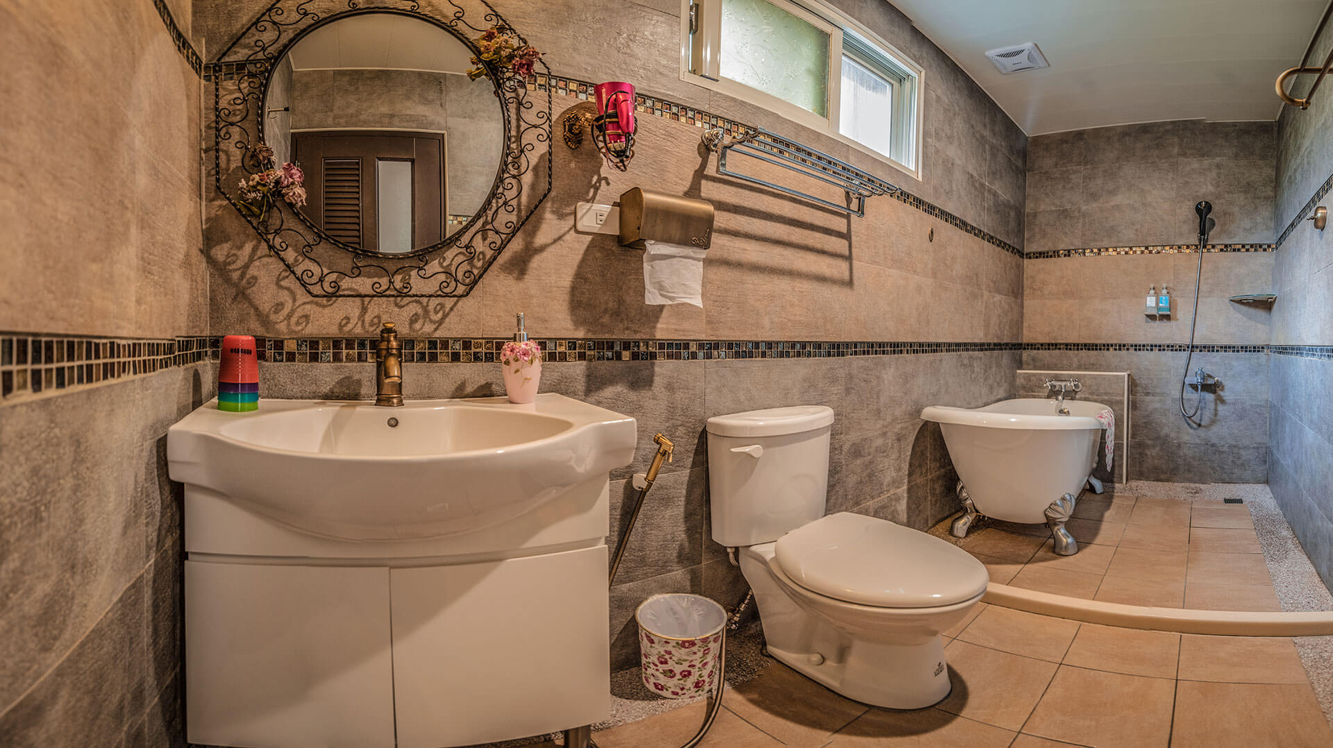 房內供應山泉水泡澡水質富含礦物質,呈水藍色
